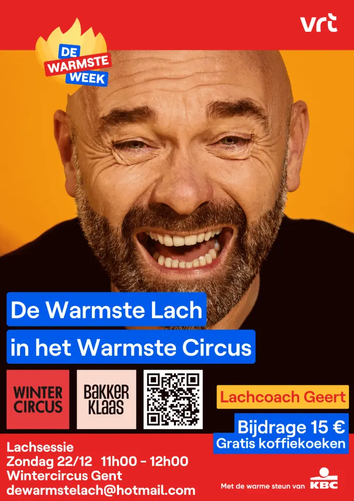 Dit jaar gaat Lachcoach Geert op zondag 22 december om 11h00 opnieuw lachend vlammen, dit jaar tegen eenzaamheid in het Warmste Wintercircus in Gent. Tijdens de lachsessie gaan we samen opwarmen, ontspannen en vooral lachen om met elkaar te verbinden.