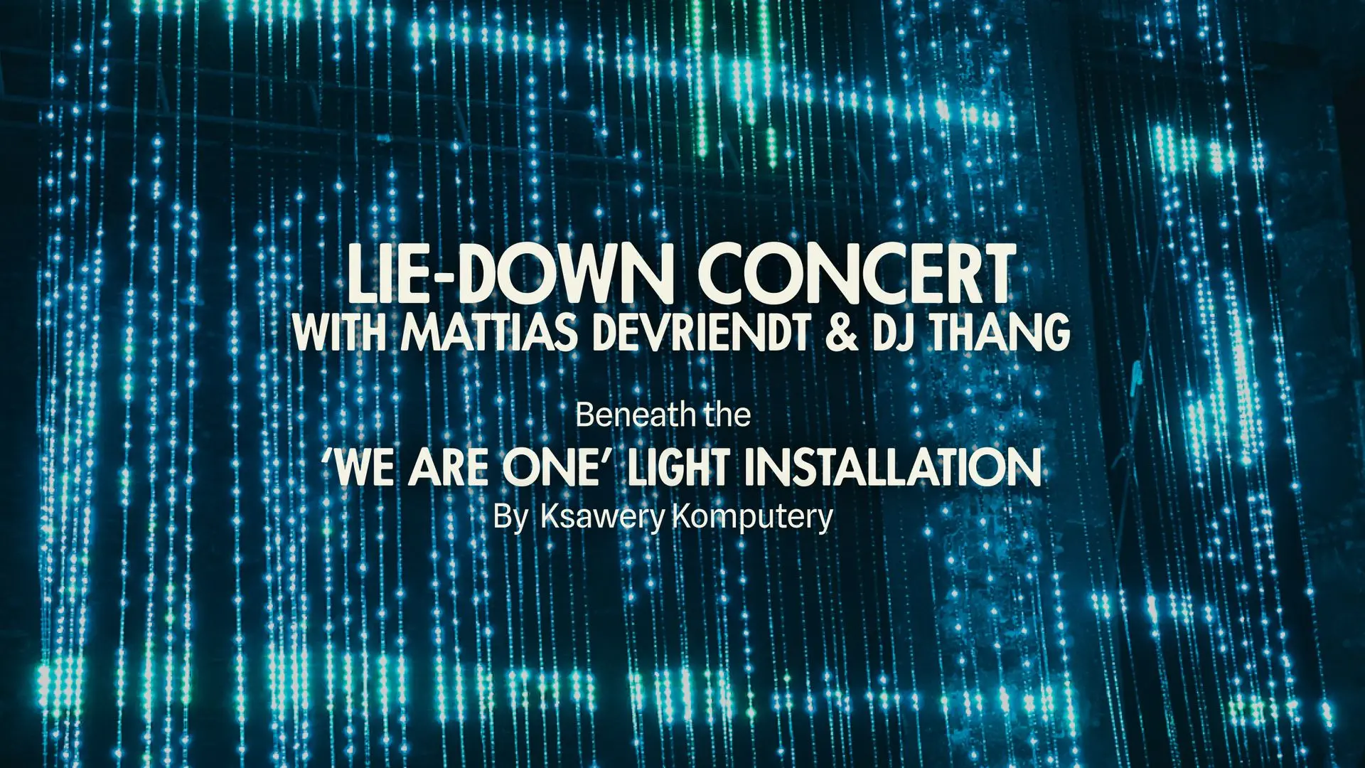 An evening that begins with an intimate lie-down piano concert by Mattias Devriendt and unexpectedly transforms into a refined DJ set by DJ Thang with live piano layered on top. Together, they create a unique musical experience in dialogue with the spectacular light installation by 'We Are One' by Ksawery Komputery.